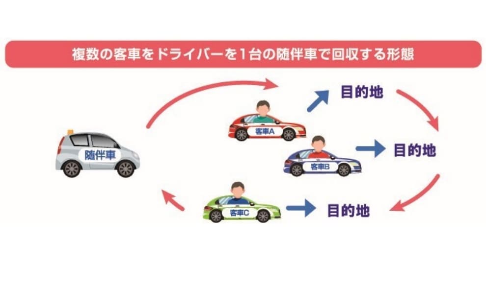客車と随伴車が必ずしもペアとはならずに、複数の客車運転手を1台の随伴車で回収する形態。